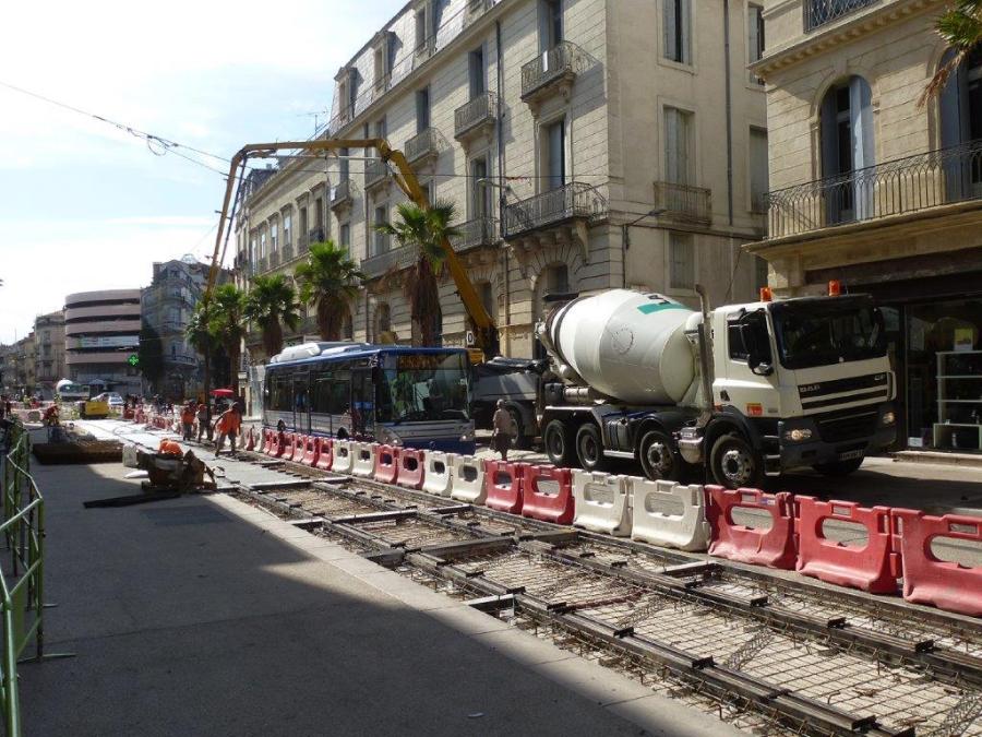 Boulevard du Jeu-de-Paume à Montpellier, du béton désactivé est coulé entre les rails de la voie montante commune aux lignes 3 et 4, le mardi matin 18 août 2015. Copyright : Louis Ferdinand