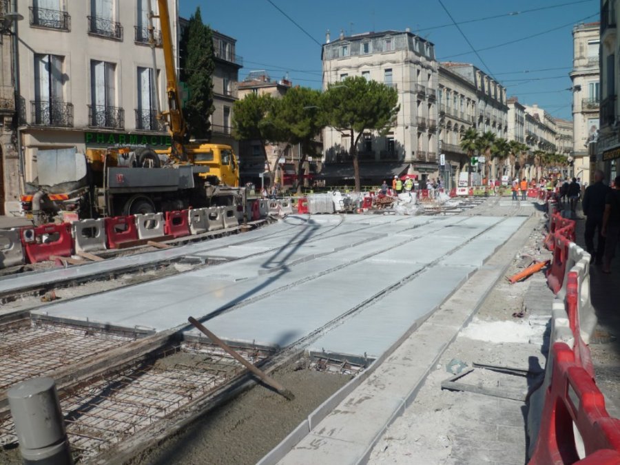 Boulevard de l’Observatoire à Montpellier, du béton désactivé tout frais vient d’être coulé entre les rails du nouvel appareil de voie et de la voie commune aux ligne 3 et 4 de tramway. Photo prise le mercredi 19 août 2015. Copyright : Edouard Paris