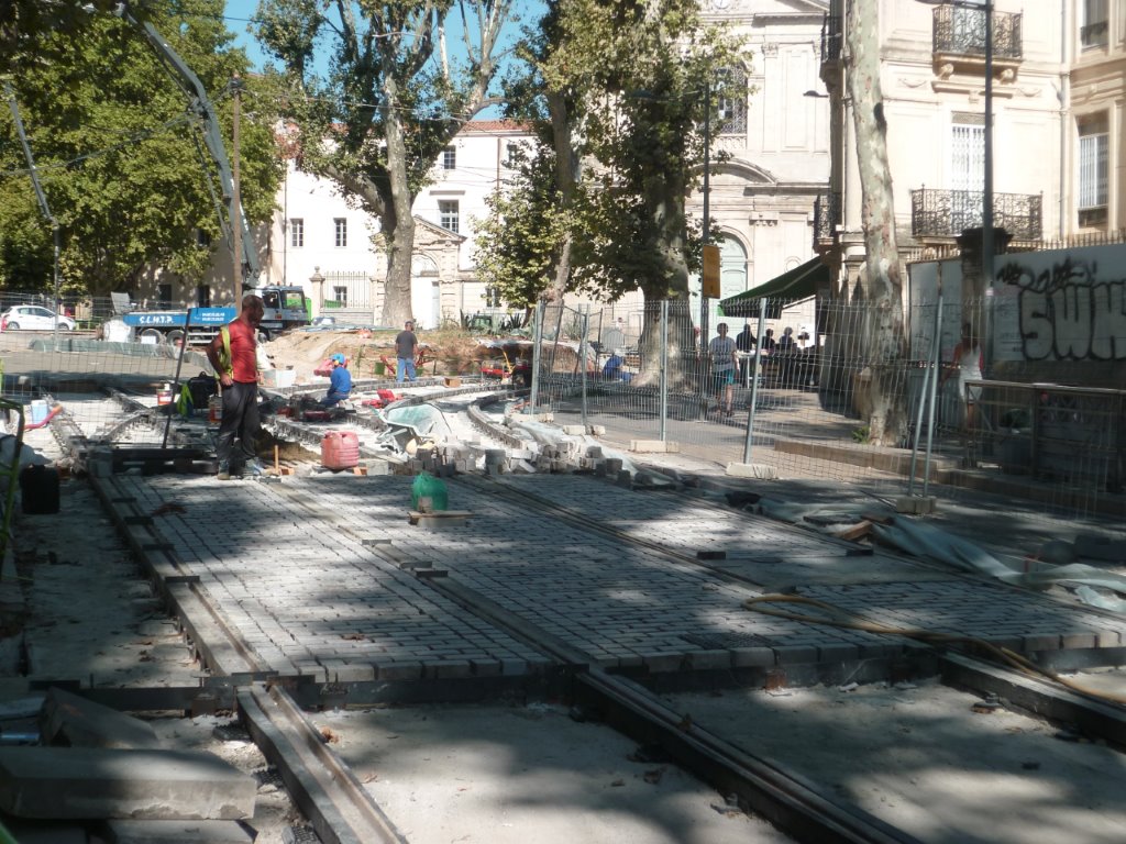 Les Portugais sont hautement qualifiés dans la pose des pavés sur le chantier de bouclage de la ligne 4 de tramway, comme ici à la limite du boulevard Pasteur et de la place Albert 1er. Photo prise le mercredi 19 août 2015. Copyright : Edouard Paris