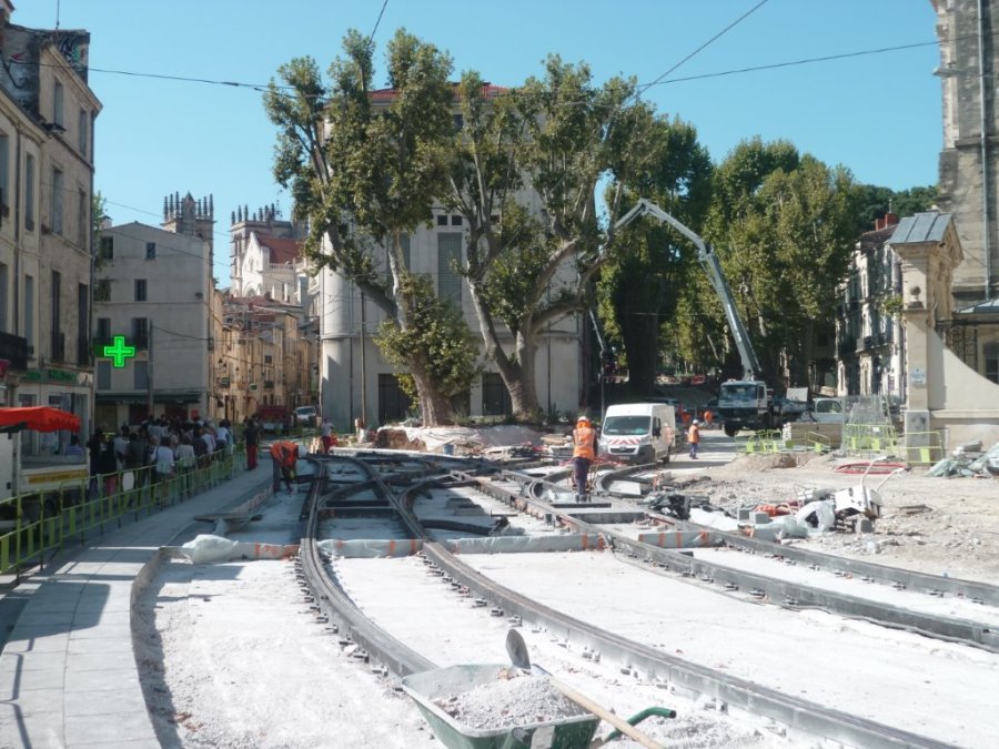 Vue de la place Albert 1er à Montpellier, le mercredi 19 août 2015, où sur ce côté les travaux de réalisation du revêtement de la plateforme du tramway n’ont pas encore commencé. Copyright : Edouard Paris
