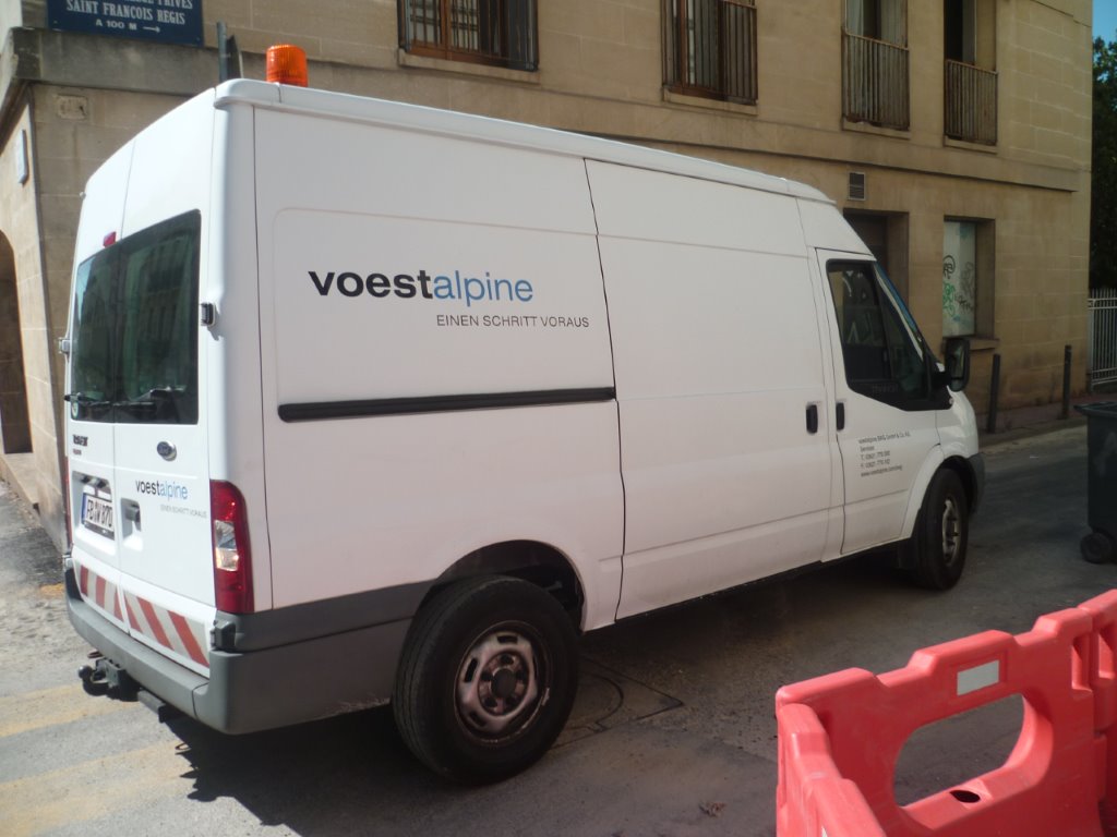 Un fourgon de la société voestalpine, qui fabrique les rails et les appareils de voies du bouclage de la ligne 4 de tramway, est photographié au début de la rue Enclos Tissié-Sarrus, le mercredi 19 août 2015. Copyright : Edouard Paris