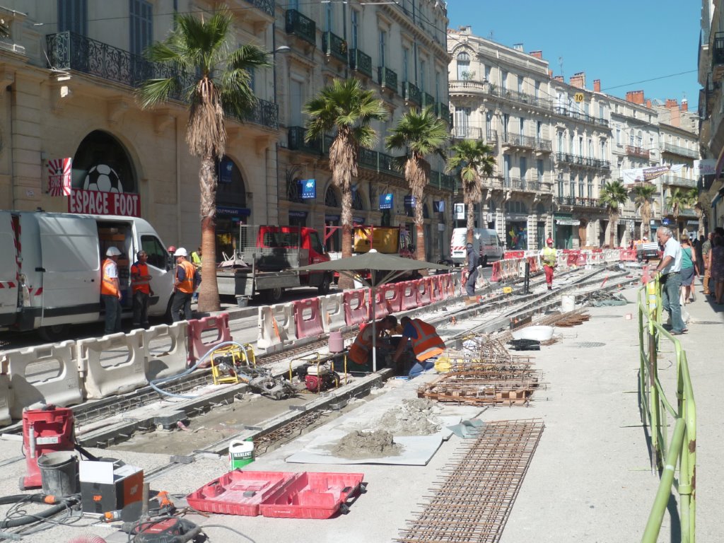 Travaux de soudures de rail sur l’appareil de voie posé boulevard du Jeu-de-Paume à Montpellier, le lendemain du coulage du béton de blocage, mercredi 19 août 2015. Copyright : Edouard Paris