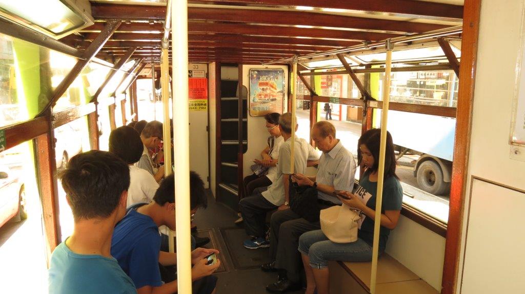 Ambiance studieuse au premier niveau de la motrice 33 du tramway électrique de Hong Kong. Photo prise le mercredi 19 août 2015. Copyright : DS7