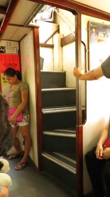 Escalier par lequel on descend du second niveau de la motrice 33 du tramway électrique de Hong Kong. Photo prise le mercredi 19 août 2015. Copyright : DS7