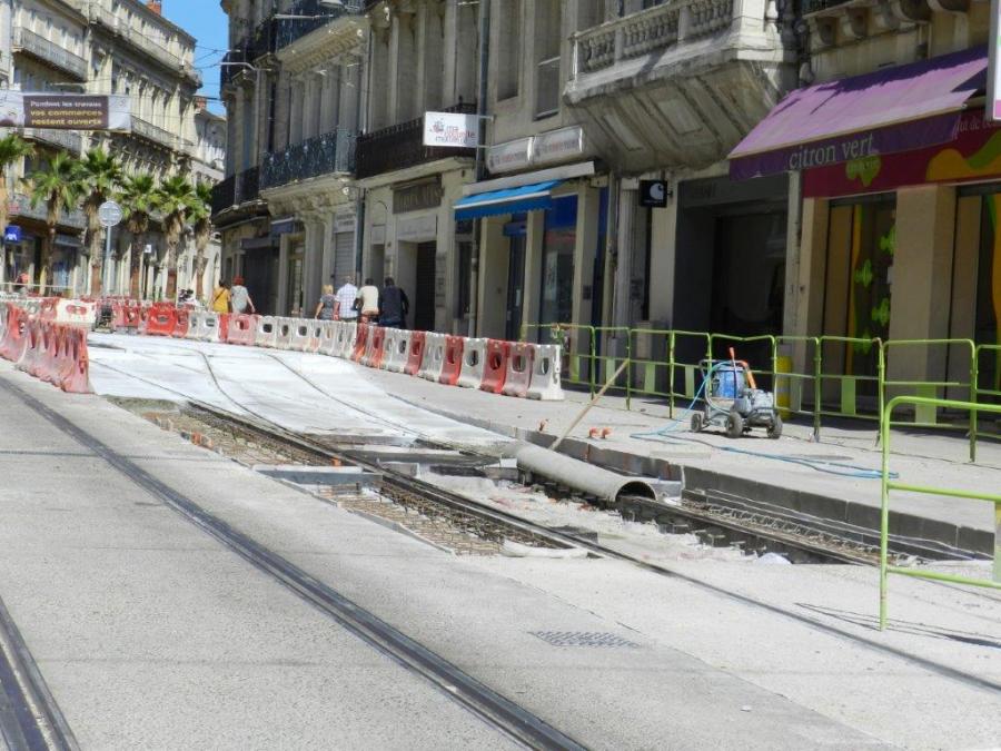 Le même aiguillage, boulevard du Jeu-de-Paume à Montpellier, photographié le matin du samedi 22 août 2015, bien après que le béton désactivé a été coulé. Copyright : Anje34