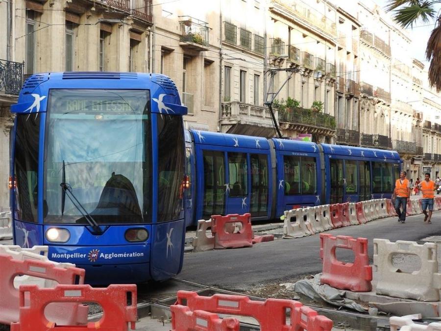 La rame 2015 Citadis 401 Alstom vient d’étrenner à son tour l’appareil de voie installé boulevard du Jeu-de-Paume permettant d’aiguiller les rames de tramway vers la voie à sens unique de la rue André-Michel, le samedi 22 août 2015, en fin d’après-midi. Copyright : Anje34