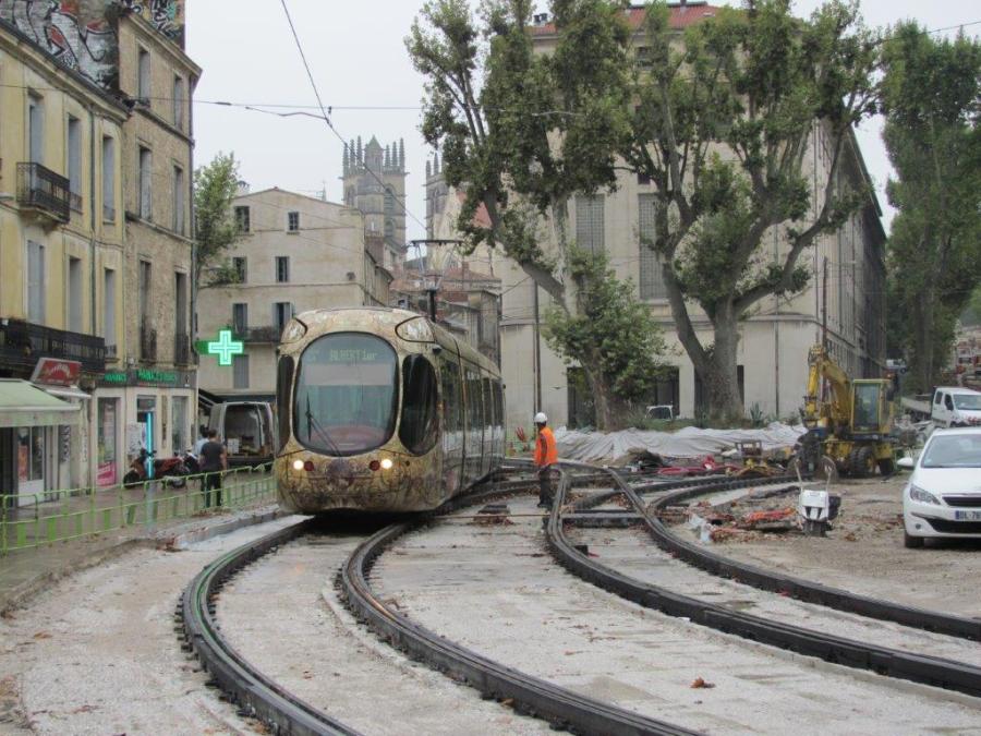 Place Albert 1er à Montpellier, la rame 2046 Citadis 302 Alstom, opérant sur la ligne 4, circule sur voie 2 à l’approche de son terminus « Place Albert 1er », le lundi 24 août 2015. Copyright : Edouard Paris