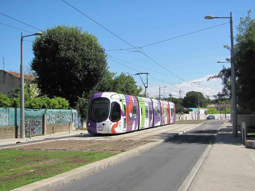 La rame 2049 Citadis 302 Alstom multiligne dont la girouette affiche « Gare Saint-Roch » est photographiée à la hauteur de la nouvelle communication de rebroussement, rue de Saint-Hilaire à Montpellier, le lundi 24 août 2015. Copyright : Edouard Paris
