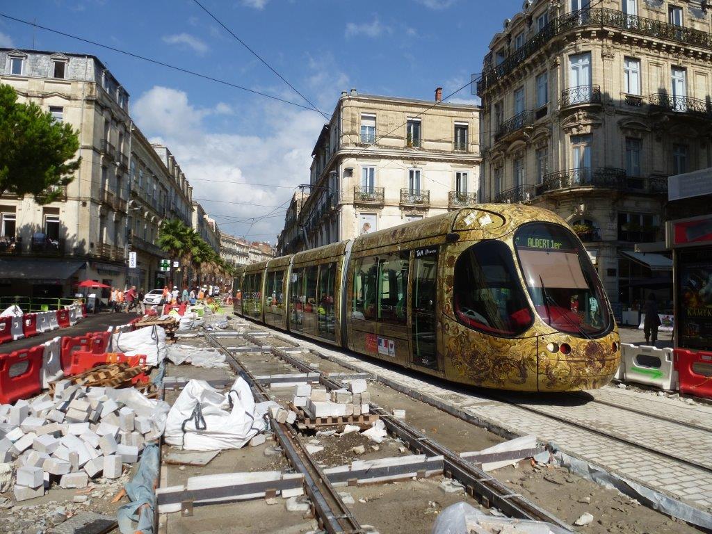 Place Edouard-Adam à Montpellier, où la rame 2031 Citadis 302 Alstom, qui avait été bloquée près de quarante minutes à l’entrée de la rue du Faubourg-de-la-Saunerie, côté place Saint-Denis, circule à contresens sur voie 2 en direction de la rue de la République. Photo prise le lundi 24 août 2015 à 11h07. Copyright : Louis Ferdinand