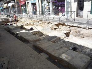 - Rue du Faubourg-de-la-Saunerie à Montpellier, photographiée le lundi 19 juillet 2010, un jour où se déroulaient des fouilles archéologiques préventives préalablement à la construction de la voie à sens unique des lignes 3 et 4 de tramway. Copyright : Michel Bozzola