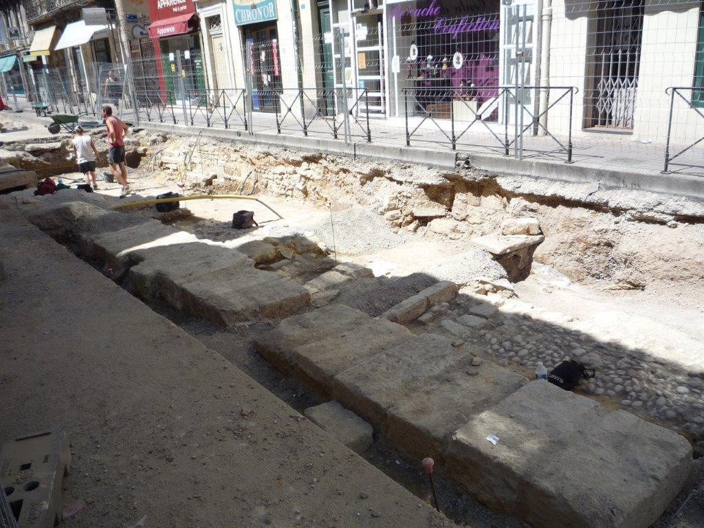 Au premier plan dans l’ombre, une partie du collecteur des eaux pluviales en pierre de Castries datant du XIXème siècle, rue du Faubourg-de-la-Saunerie, photographiée le lundi 19 juillet 2010. Copyright : Michel Bozzola