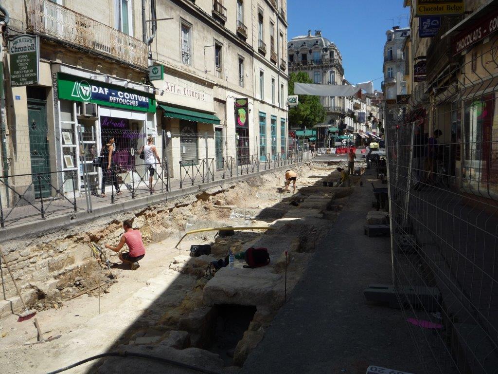 Rue du Faubourg-de-la-Saunerie à Montpellier, photographiée le lundi 19 juillet 2010, un jour où se déroulaient des fouilles archéologiques préventives préalablement à la construction de la voie à sens unique des lignes 3 et 4 de tramway. Copyright : Michel Bozzola