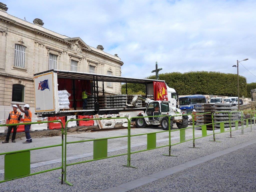 Livraison de traverses bi-blocs tout en haut du boulevard Ledru-Rollin, le jeudi 27 août 2015. Copyright : Anje34