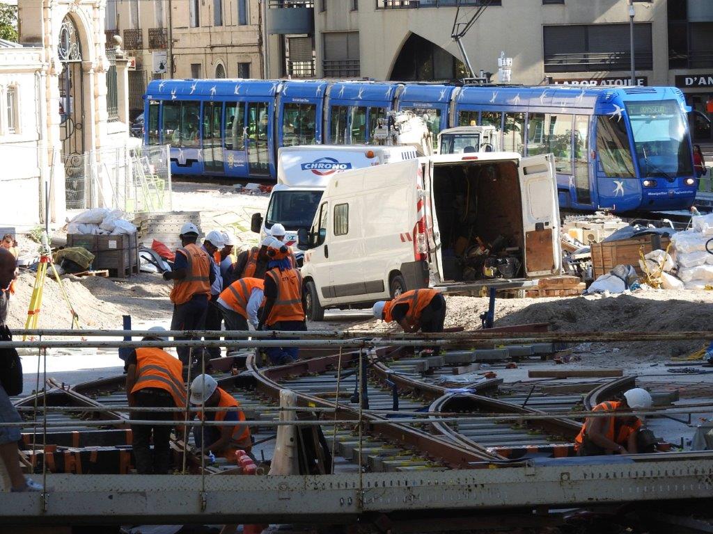 Installation d’appareils de voie place Albert 1er à Montpellier, au bas du boulevard Henri IV, le jeudi 27 août 2015. Copyright : Anje34