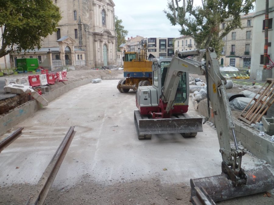 Photographie de la place Albert 1er à Montpellier, prise depuis le bas du boulevard Henri IV, le dimanche 23 août 2015. Copyright : Edouard Paris