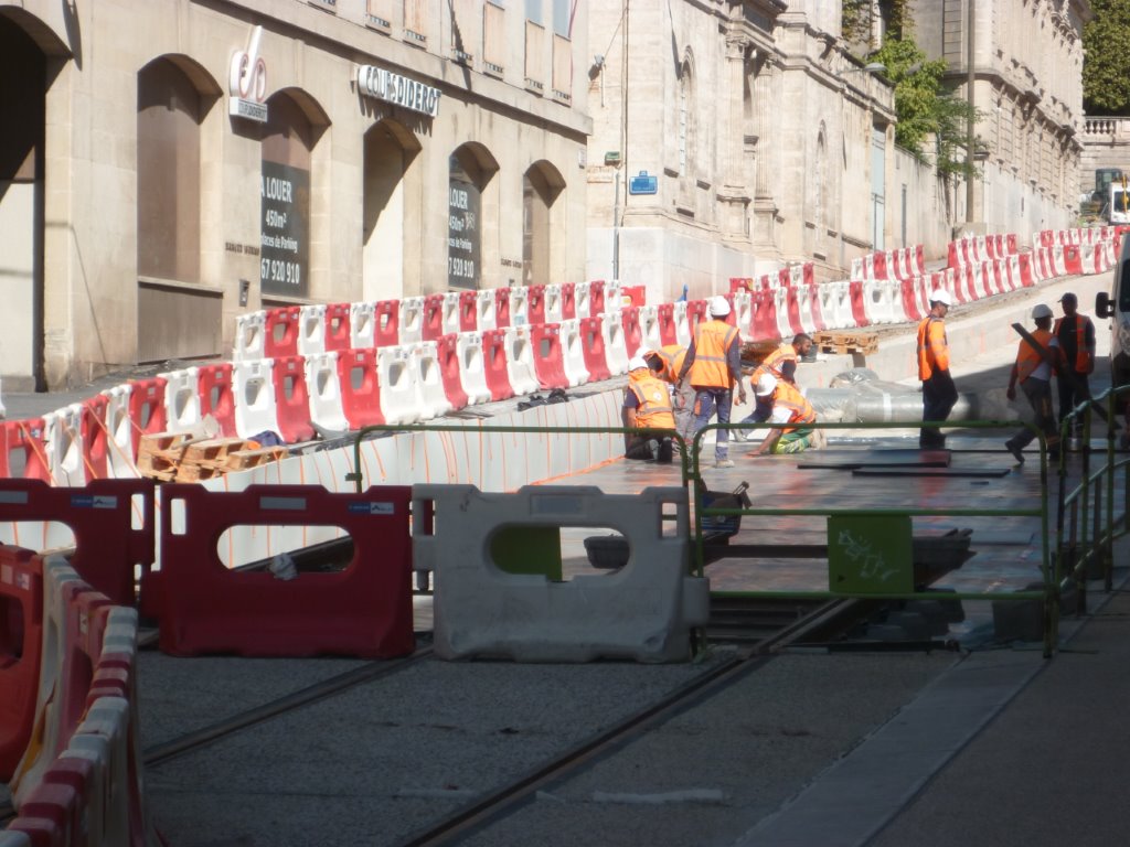 Boulevard Ledru-Rollin à Montpellier, une équipe procède à la pose d’éléments d’un tapis anti-vibratile sur la couche de fondation de la plateforme du chaînon manquant de la ligne 4 de tramway. Photo prise le mardi 25 août 2015. Copyright : Edouard Paris