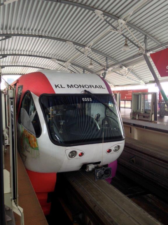 Aperçu d’une des cabines d’extrémité d’une rame à double caisse de la ligne de monorail de Kuala Lumpur (KL Monorail) à la station « Hang Tuah » (MR4). La rame en question circule en direction du terminus « Titiwangsa » (MR11). Comme toutes les autres, cette station va être équipée de portes palières en bordure des quais. Photo prise le vendredi 21 août 2015