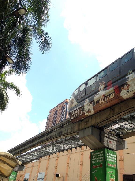 A Kuala Lumpur, les rames de la ligne de monorail (KL Monorail) sont en général revêtues de livrées publicitaires aussi extravagantes que celles qui habillent les motrices du tramway électrique de Hong Kong. Photo prise le vendredi 21 août 2015. Copyright : Karine D