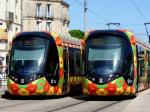 - Exemple de l’application du logo Montpellier Méditerranée Métropole sur le nez de deux rames Citadis 402 Alstom opérant sur la ligne 2. Photo prise le mardi 8 septembre 2015. Copyright : Anje34