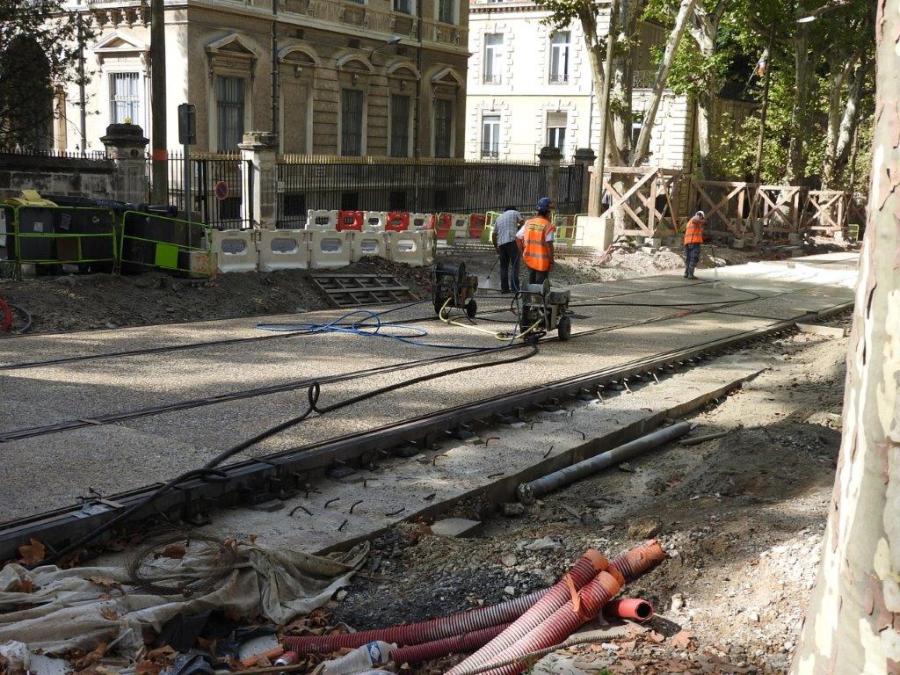 Boulevard Henri IV à Montpellier, rinçage à haute pression du béton désactivé fraîchement coulé dans le but de faire apparaître les granulats de couleur. Photo prise le mercredi 2 septembre 2015. Copyright : Anje34