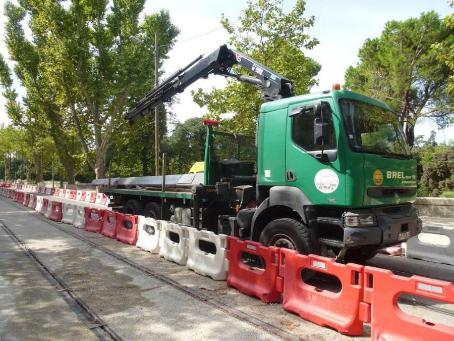 Boulevard Henri IV à Montpellier, à la hauteur du Jardin des Plantes, un camion de l’entreprise Brel livre les mâts auxquels seront attachés les câbles de soutien des lignes aériennes de contact, le jeudi 10 septembre 2015. Copyright : Louis Ferdinand