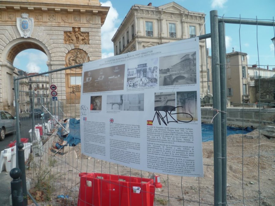 Panneau d’information en trois langues sur la restauration du pont Vialleton à Montpellier, dont l’achèvement est programmé pour le mois d’octobre 2015. Photo prise le vendredi 11 septembre 2015. Copyright : Edouard Paris