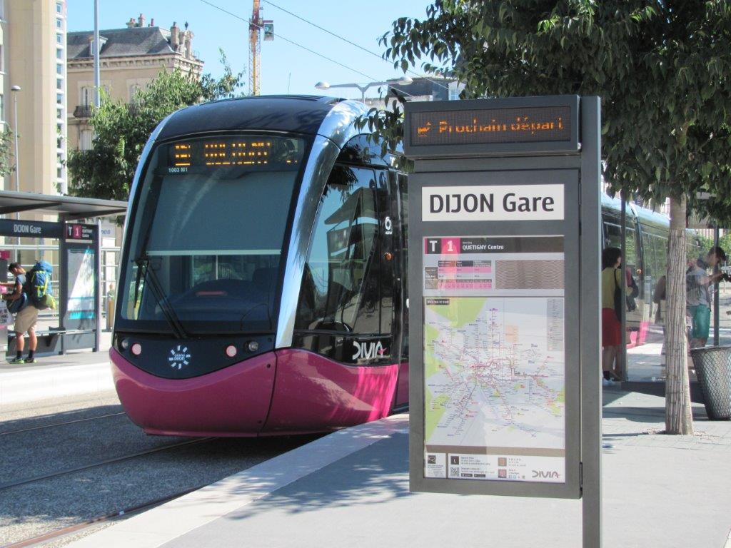 Dès la sortie de la gare de Dijon-Ville, les voyageurs peuvent monter à bord d’une rame de la ligne T1 au terminus « DIJON Gare ». La station « Foch Gare », commune aux lignes T1 et T2 se trouve à cent mètres de là. Photo prise le dimanche 30 août 2015. Copyright : Edouard Paris
