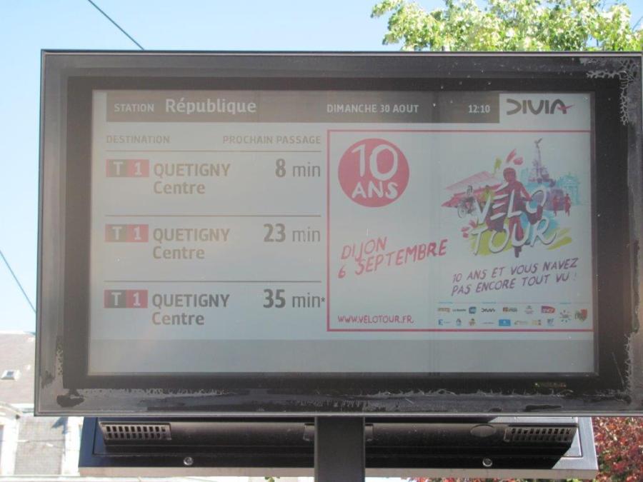 Ecran d’information installé en hauteur sur le quai direction QUETIGNY Centre de la station « République » propre à la ligne T1 de tramway à Dijon. Photo prise le dimanche 30 août 2015. Copyright : Edouard Paris
