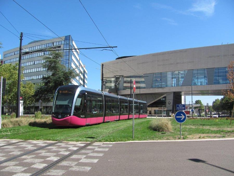 Sur le T1, la rame 1003 Citadis 302 Alstom, en direction du terminus « DIJON Gare », traverse le rond-point de la place Jean-Bouhey, après avoir quitté la station « Auditorium », le dimanche 30 août 2015. Copyright : Edouard Paris