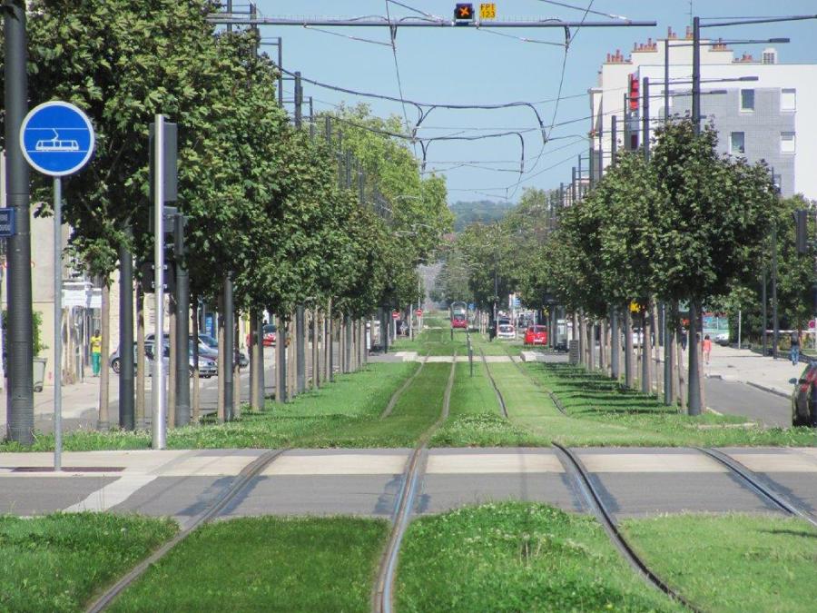Zoom sur les voies de la ligne T2, avenue du Drapeau, en direction de « DIJON Valmy ». Photo prise le dimanche 30 août 2015. Copyright : Edouard Paris