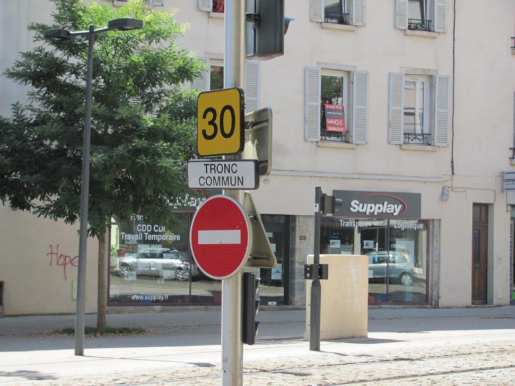 Boulevard de la Trémouille à Dijon, début du tronc commun T1 T2 limité à 30 km/h entre la place de la République et la station « Foch Gare ». Photo prise le dimanche 30 août 2015. Copyright : Edouard Paris