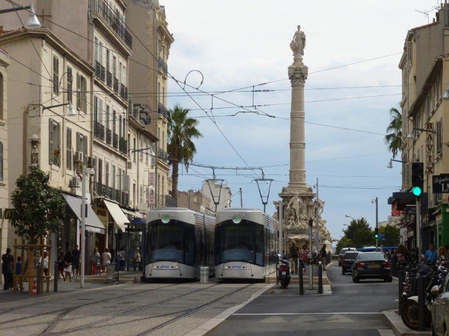 Terminus « Castellane » du T3 à Marseille où les rames 006 et 022 Flexity Outlook Bombardier sont stationnées avant de repartir l’une après l’autre vers « Arenc Le Silo », le vendredi 4 septembre 2015. Copyright : Louis Ferdinand