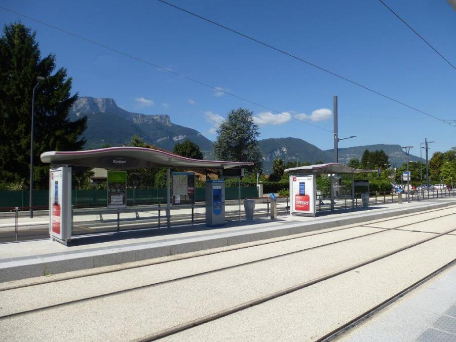 Sur la commune de Saint-Egrève, vue sur le mobilier de la station « Karben », quai direction « Louise Michel », située sur la seconde section de la ligne E de tramway grenoblois mise en service le lundi 13 juillet 2015. Photo prise le lundi 7 septembre 2015. Copyright : Louis Ferdinand