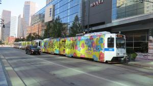 - A Denver, une triplette de rames Siemens SD-160 opérant sur la ligne H, rame 323 en queue à la livrée Chick-Fil-A, une chaîne de restauration rapide, s’engage dans California Street à la hauteur de l’hôtel Hyatt Regency. Photo prise le samedi 26 septembre 2015. Copyright : DS7