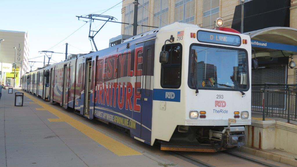 A Denver, une triplette de rames Siemens DS-160, rame 293 en tête, est photographiée à la station « 20th and Welton » à quai central de la ligne D. Dans le futur, cette station sera desservie par la nouvelle ligne L. Photo prise le samedi 26 septembre 2015. Copyright : DS7