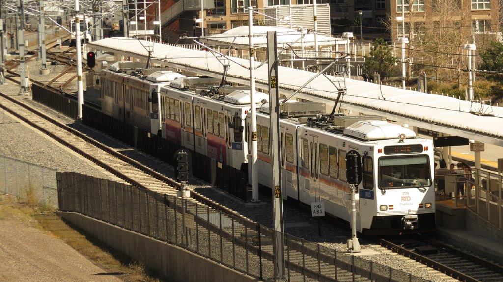 A Denver, une triplette de rames Siemens SD-160, rame 226 en tête, est photographiée au terminus « Denver Union Station » commun aux lignes C, E et W, depuis le Millennium Bridge, le samedi 26 septembre 2015. Copyright : DS7