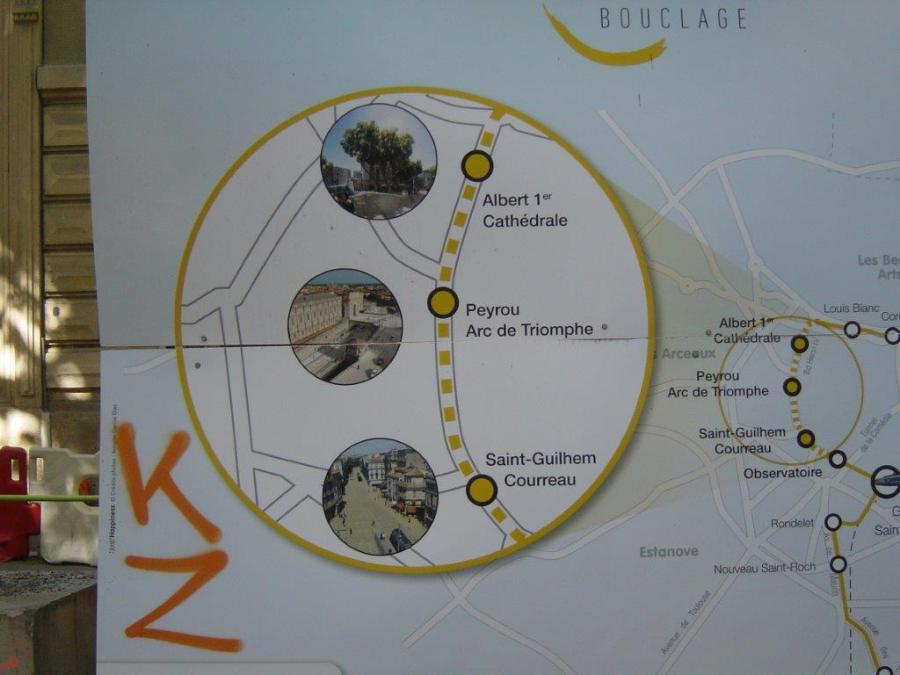 Boulevard Henri IV à Montpellier, à la hauteur de la future station « Albert 1er – Cathédrale », un panneau d’information montre les emplacements des trois futures stations à réaliser sur le chaînon manquant de la ligne 4. Si l’emplacement de la station « Saint-Guilhem – Courreau » est bien indiqué, l’illustration qui l’accompagne présente au premier plan un bout de la station « Observatoire ». Photo prise le mercredi 23 septembre 2015. Copyright : JJD