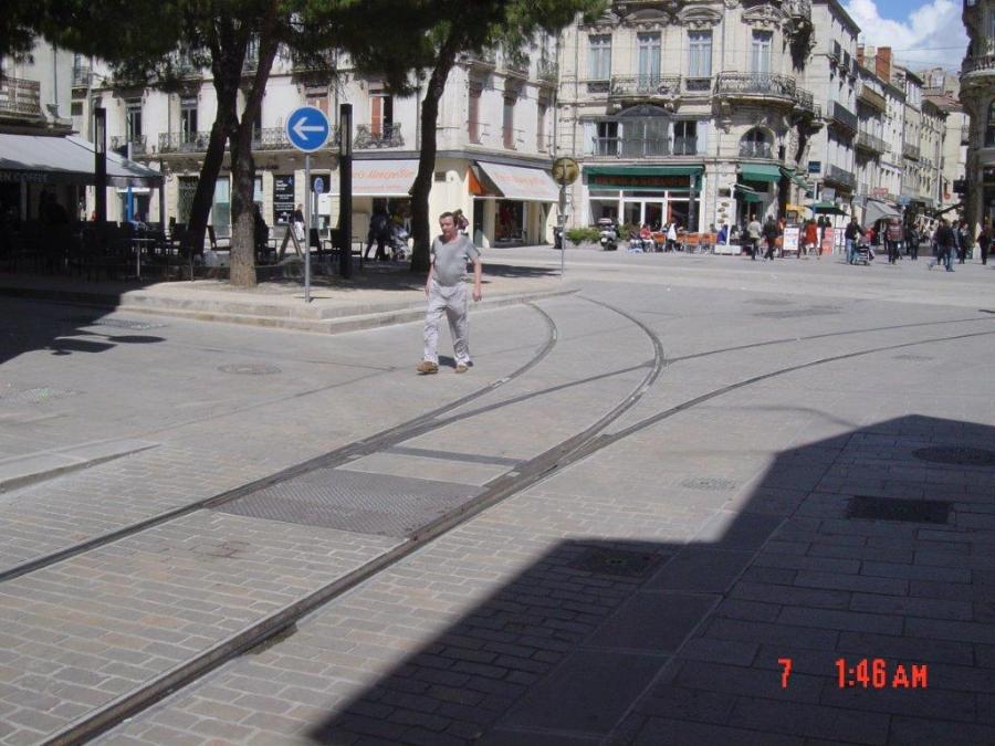 Une image du passé : le coupon de voie venant butter contre une bordure d’une petite placette arborée, place Edouard-Adam à Montpellier, le samedi 7 avril 2012. Copyright : JJD
