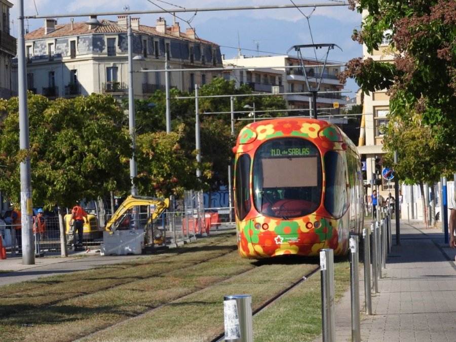 Avenue de Maurin à Montpellier, la rame 2050 Citadis 302 Alstom passe à la hauteur de la future voie de sortie du parking Saint-Roch, le jeudi 1er octobre 2015. Copyright : Anje34