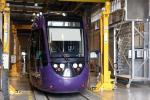 - Au technicentre du tram-train de l’ouest lyonnais, la rame TT 211 Citadis Dualis Alstom est photographiée sur la voie en terre-plein du bâtiment principal, le mercredi 7 octobre 2015. Copyright : Yvon Brument