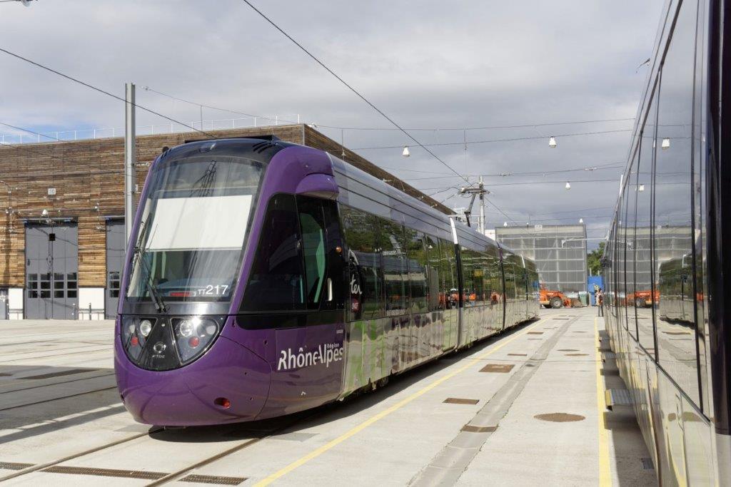 Au technicentre du tram-train de l’ouest lyonnais, la rame TT 217 Citadis Dualis Alstom est photographiée sur une des voies du faisceau extérieur, le mercredi 7 octobre 2015. En arrière plan sur la gauche, le bâtiment principal de ce centre d’entretien et de maintenance. Copyright : Yvon Brument