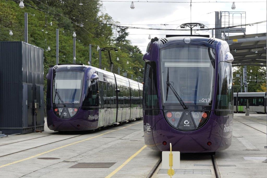 Au technicentre du tram-train de l’ouest lyonnais, les rames TT 220 et TT 217 Citadis Dualis Alstom sont photographiée sur des voies du faisceau extérieur, le mercredi 7 octobre 2015. Copyright : Yvon Brument