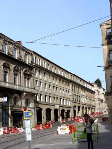 - Boulevard du Jeu-de-Paume à Montpellier, un câble de soutien des lignes aérienne de contact a été fixé à un immeuble situé côté rue du Faubourg-de-la-Saunerie et rattaché à deux câbles fixés à deux immeubles du bas de la rue Saint-Guilhem. Photo prise le dimanche 4 octobre 2015. Copyright : Anje34