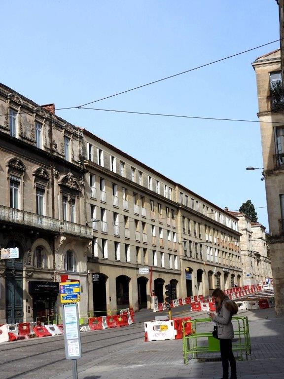 Boulevard du Jeu-de-Paume à Montpellier, un câble de soutien des lignes aérienne de contact a été fixé à un immeuble situé côté rue du Faubourg-de-la-Saunerie et rattaché à deux câbles fixés à deux immeubles du bas de la rue Saint-Guilhem. Photo prise le dimanche 4 octobre 2015. Copyright : Anje34
