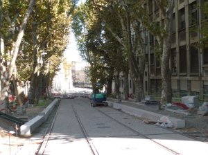 - Boulevard Ledru-Rollin à Montpellier, où les voies sont dans l’attente de leur revêtement en béton désactivé. Photo prise le samedi 17 octobre 2015. Copyright : Edouard Paris