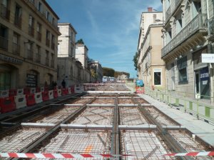 - Place Edouard-Adam à Montpellier, il manque encore quelques pavés à poser à droite de l’aiguillage qui se situe au bout de la rue du Faubourg-de-la-Saunerie. Photo prise le samedi 17 octobre 2015. Copyright : Edouard Paris