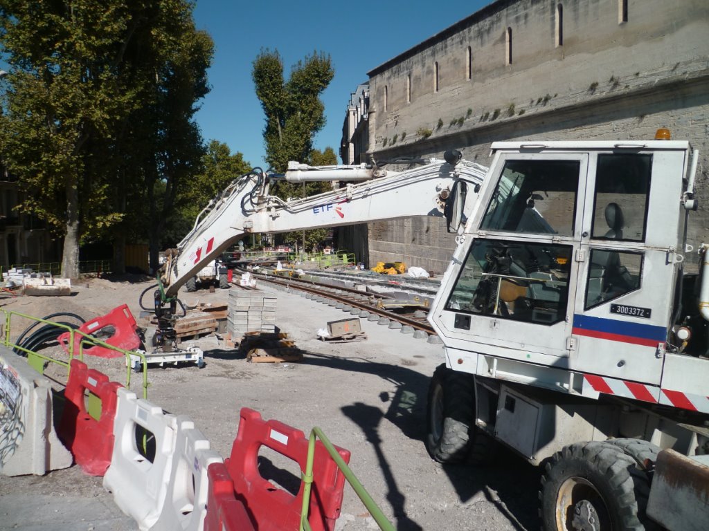 Engin de chantier rail-route, opérant sur le chantier de pose des voies du chaînon manquant de la ligne 4 de tramway, photographié sur le boulevard du Professeur Louis-Vialleton, le vendredi 16 octobre 2015. Copyright : Edouard Paris