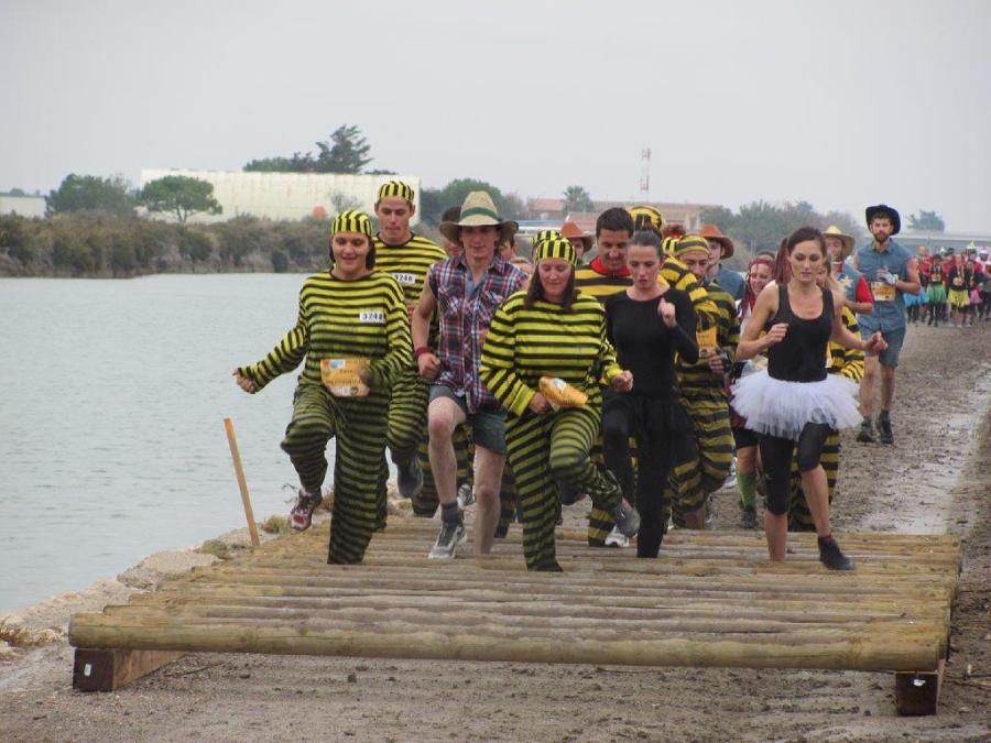 Franchissement de plusieurs rondins de bois par des concurrents de la seconde édition de la ruée des fadas de Palavas-les-Flots, le long du canal du Rhône à Sète, le dimanche 18 octobre 2015. Copyright : Edouard Paris