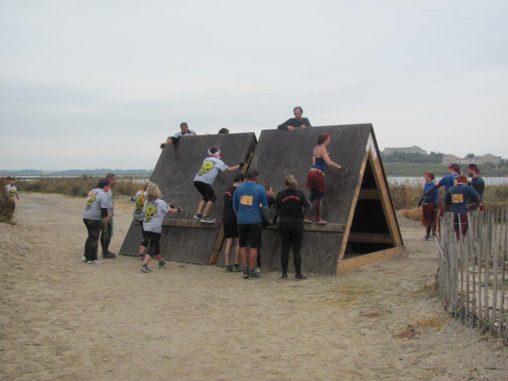 Face à la cathédrale de Maguelone au fond à droite, le chemin de croix ne fait que commencer pour la plupart des concurrents de la seconde édition de la ruée des fadas de Palavas-les-Flots, le dimanche 18 octobre 2015. Copyright : Edouard Paris