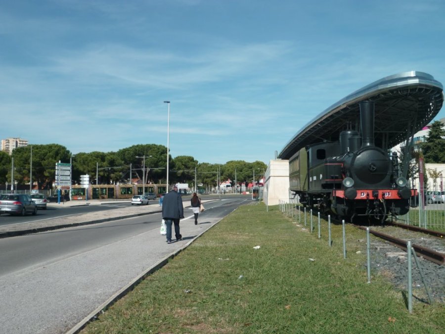 A compter du lundi 2 novembre 2015, la ligne d’autobus 131 Hérault Transport reliera Palavas-les-Flots « Salle Bleue » à Montpellier « Garcia Lorca », où elle sera en correspondance avec les rames de la ligne 4 de tramway. Photo prise le samedi 17 octobre 2015 au rond-point des Prés-d’Arènes à Montpellier en bordure duquel sont exposées à l’air libre une locomotive et une voiture voyageurs du Petit Train de Palavas. Copyright : Edouard Paris